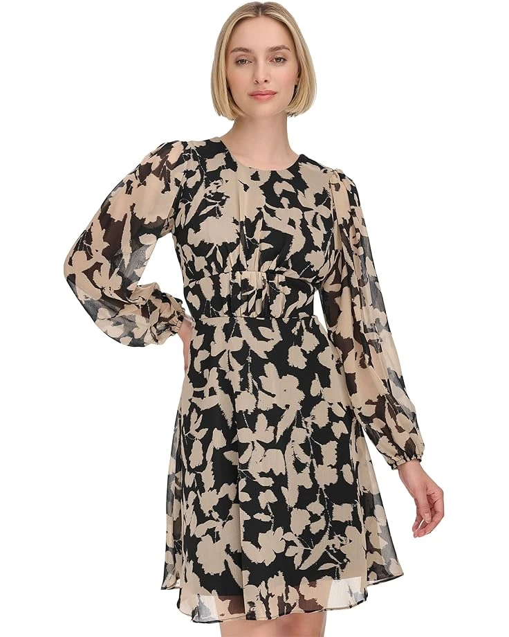 - Steal the spotlight wearing Calvin Klein® Chiffon Long Sleeve Floral Rouched Aline Dress with heels or boots. The A-line dress features a round neck, long sleeves with elasticated cuffs, back zipper closure, rouched waist, and a knee-length silhouette. The allover floral printed details add a stunning style to the look.